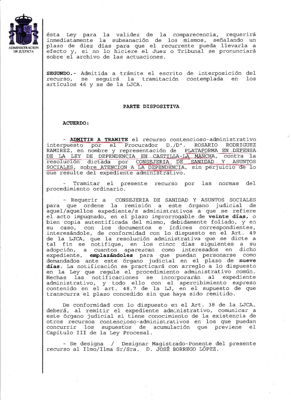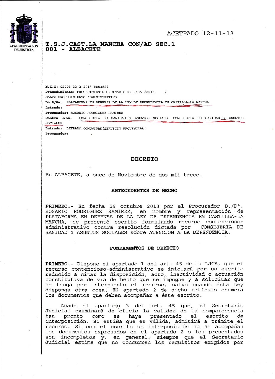 La Plataforma en Defensa de la Ley de Dependencia en Castilla-La Mancha interpuso en Octubre de 2013 ante el Tribunal Superior de Justicia de Castilla-La Mancha recurso contra la Orden de Julio de 2013 de la Consejería de Sanidad y Asuntos Sociales sobre prestaciones e intensidades de la Ley de Dependencia